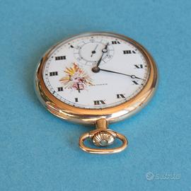 Raro orologio vintage da tasca HAMILTON – USA – cal. 910, serie n. 1840300, 17 rubini, prodotto negli anni 1915 - 1920. Cassa in acciaio placcato oro 10 ct, diametro 47 mm esclusa la corona. Quadrante in porcellana smaltata bianca con decoro colorato, indici delle ore in numeri romani, contatore piccoli secondi ad ore sei. Vetro minerale originale, spessore orologio 11 mm. Apertura coperchio quadrante-fondello a ribaltina. Stupendo orologio in eccellenti condizioni, perfettamente funzionante.