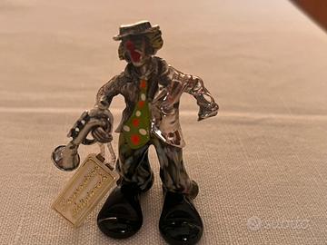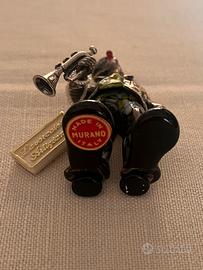 In vendita splendida scultura da collezione raffigurante un clown musicista con sassofono, un classico del design artistico italiano. L'opera si distingue per il raffinato contrasto materico tra la lucentezza del metallo prezioso e la vivacità del vetro artigianale.