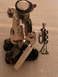 Materiali: Parte superiore, cappello e strumento realizzati in Argento 800. Gambe in Vetro di Murano policromo lavorato a mano con tecnica a macchie.