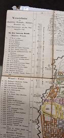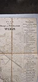 Splendido e raro esemplare originale del "Plan der k.k. Haupt- und Residenzstadt WIEN" (Piano della I.R. Città Capitale e di Residenza di Vienna), pubblicato dalla prestigiosa casa editrice Artaria & Co. Questa mappa non è una semplice stampa cartacea, ma un pregiato montaggio su tela "sezionato" (dissected map), una tecnica dell'Ottocento utilizzata per rendere le grandi mappe tascabili e resistenti. La mappa è stata divisa in 15 sezioni cartacee e incollata su una tela di lino originale, che funge da cerniera per ripiegarla. La mappa riporta chiaramente nel Verzeichniss (Indice degli edifici) al numero 1151 la dicitura "Artaria's Kunsthandlung". Artaria & Co. era il punto di riferimento assoluto per la cartografia e la musica nella Vienna asburgica. Lo stile cartografico, la suddivisione dei distretti e, soprattutto, la presenza delle mura e dei bastioni ancora intatti (visibili nella parte centrale colorata in rosa) datano la mappa con certezza tra il 1845 e il 1855, poco prima che l'Imperatore Francesco Giuseppe ordinasse la loro demolizione nel 1857 per creare la Ringstraße. È una fotografia fedele della Vienna pre-moderna. Splendida e vivace colorazione a mano (o litografica d'epoca) per distinguere i quartieri storici e le aree verdi. Include un Verzeichniss completo degli edifici pubblici, istituti e alberghi, ordinati per quartiere (Schotten-Viertel, Wimmer-Viertel, Kärntner-Viertel, ecc.) e per Vorstädte (Leopoldstadt, Landstraße, Wieden). Il retro in tela (foto 8) presenta un'affascinante scritta calligrafica a mano in corsivo rosso: "Vienna", traccia dell'uso e della provenienza dell'oggetto da parte di un proprietario del XIX secolo. L'oggetto è autentico al 100% e ha circa 170 anni. La tela di lino è integra e permette alla mappa di piegarsi e aprirsi senza problemi. Le sezioni di carta sono ben adese. Presenta i normali e fisiologici segni del tempo. Fioriture (Foxing): Diffuse macchioline marroni da ossidazione, visibili sia sulla carta che sulla tel