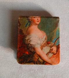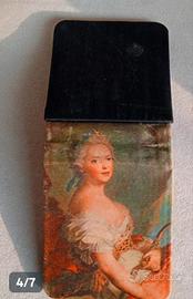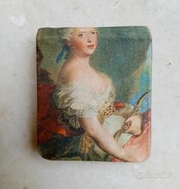 Elegante porta fiammiferi vintage in raso rosso, con un'immagine decorativa di una donzella del 800 - Design d'epoca. - Materiale: raso. - Made in Italy.