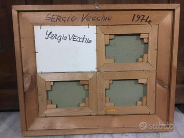 Sergio Vecchio (Paestum, 1947 – 2018). Artista singolare e intrigante, pittore, disegnatore, ceramista, collezionista, creatore di un ricco archivio-laboratorio su Paestum fatto di cartoline, fotografie, manoscritti, libri, quadri e dipinti. Paestum è per lui terra natia e luogo dell’anima, fonte inesauribile di ispirazione estetica, dove lavora nel suo atelier tra pittura, scritture ed elaborazione grafica, particolarmente sui temi della Magna Grecia, e dove invita e accoglie artisti di fama internazionale. Studia pittura all’Accademia di Belle Arti di Napoli, iniziando giovanissimo un’intensa attività espositiva in Italia e all’estero. Partecipa alla X Quadriennale di Roma (1975), espone alla Galleria Comunale d’Arte Moderna di Ancona (1978), e nel 1982 partecipa alla mostra “Immaginario Riflesso”, curata da Massimo Bignardi, esposizione itinerante allestita prima presso il Chiostro dell’ex convento SS. Pietà di Teggiano (Sa), poi nel Museo Provinciale di Salerno, agli Antichi Arsenali di Amalfi (Sa) 1983 ed infine a S. Leucio (Ce). Nel 1958 in una personale a Milano è notato da Lisa Licitra Ponti che ne scrive in modo lusinghiero su Domus; nel 1984 su segnalazione del famoso critico d’arte Pierre Restany è inserito nel Catalogo Generale della Grafica Italiana dell’Arte Mondadori. Nello stesso periodo, in collaborazione con il Laboratorio di Nola (una delle più importanti calcografie d’Italia), realizza cartelle di incisioni con le quali è invitato a prestigiose rassegne del settore in Italia e all’estero (Galassia Gutemberg, Napoli 1992; Mostra del libro d’Arte, Firenze, Pavia, 1993; Museo d’Arte Contemporanea, L’Aquila 2002; Soirée Cicliste, Roma 2003, ecc). Lavora su supporti che variano nel tempo, tela,