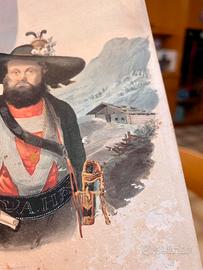 Ritratto storico di Andreas Hofer, eroe nazionale tirolese, raffigurato nel 1809 con il costume tradizionale della Val Passiria. Tecnica: Pregevole stampa d'epoca (litografia/incisione) interamente rifinita e colorata a mano ad acquerello. La qualità dei dettagli e della colorazione la rende simile a un dipinto originale. In basso a sinistra riporta la dicitura editoriale: "Innsbruck bey Fr. Unterberger", noto editore d'arte del XIX secolo. In basso a destra è presente la sigla dell'artista HL (riconducibile alla scuola di Hieronymus Löschenkohl). Presente un timbro a secco (impressione a rilievo) sulla carta in alto a destra, segno di carta di alta qualità dell'epoca. Dimensione Totale con cornice: 19x24 cm Stato di conservazione: L'opera è originale dell'Ottocento e presenta una bellissima patina del tempo. La carta mostra alcune fioriture (macchie ambrate tipiche dell'epoca) che ne garantiscono l'autenticità. La cornice dorata è coeva e in buono stato, completa di gancio originale per l'affissione. Rarità