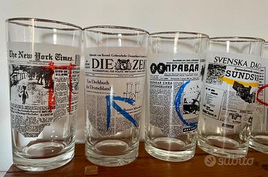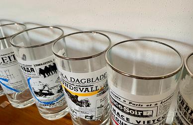 Rara Collezione di Bicchieri da Long Drink Vintage con riproduzione serigrafata di prime pagine di quotidiani nazionali del 1965 in condizioni eccellenti.