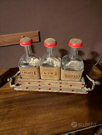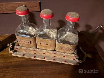 Vendo elegante set vintage composto da 3 bottiglie in vetro con rivestimento effetto pelle e supporto originale coordinato. Dettagli: •Bottiglie etichettate: Cognac, Gin, Whisky •Tappi originali con finitura rossa •Struttura con base rigida e manici laterali •Design rétro, perfetto stile anni ‘50/‘60 •Ottimo impatto scenografico Condizioni: Buone condizioni generali. Presenti segni del tempo coerenti con l’età che ne valorizzano il carattere vintage. Vetro integro. Perfetto per: •arredamento bar, lounge, locali •allestimenti vintage / scenografie •collezionisti Prezzo: 50 euro 📍 Ritiro a mano / spedizione disponibile