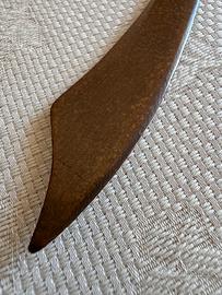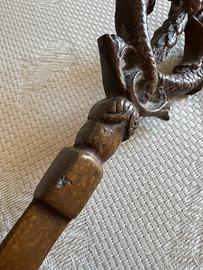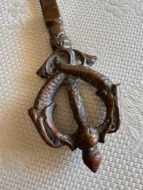 Raffinato tagliacarte d'epoca fuso in bronzo massiccio. L'impugnatura è finemente cesellata e traforata, raffigurante due creature mitologiche intrecciate (Draghi/Delfini araldici). EPOCA: Prima metà del XX Secolo (1920-1940 circa). • MATERIALE: Bronzo massiccio a fusione. • Lunghezza: 21,5 cm • Peso: 133 g (solido e bilanciato) • STATO: Eccellente. Conservato in vetrina; patina naturale bruna coerente con l'epoca, nessuna traccia di ossidazione attiva o deformazioni.