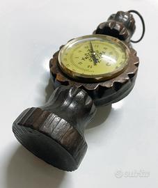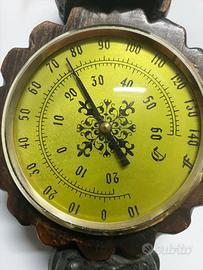 Termometro bimetallico antico con doppio sistema di montaggio: da appoggio e con occhiello superiore per fissaggio a parete.