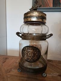 Finiture: Struttura decorativa in metallo con fregi floreali, piedini a zampa di leone e coperchio sormontato da una statuina dettagliata.