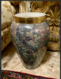 ELEGANTE e RAFFINATO grande vaso decorativo, può fungere anche da portaombrelli, stile SATSUMA/KUTANI GIAPPONESE, realizzato in porcellana. Presenta un motivo floreale intricato e multicolore, che ricorda un arazzo. Il bordo superiore è rifinito con una fascia dorata lucida. Articolo antico/vintage da collezione, riconducibile alla fine XIX secolo. CONDIZIONI: ottimo stato conservativo ma essendo un articolo antico/vintage può presentare i lievi segni del tempo che ne attestano l'originalità e il fascino. Proveniente da collezione privata di famiglia.