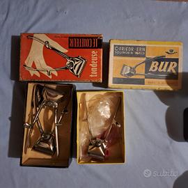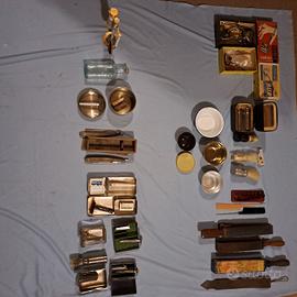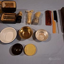 Oggetti d'epoca da barbiere o uso personale. Dalla scatolina foderata velluto militare, al porta rasoi in legno e rispettivi manici, porta sapone vari materiali, affila rasoi con manico e a striscia, pennello a scomparsa componibile in cilindro acciaio,