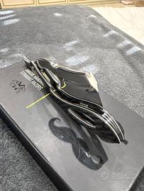 Questo rasoio in partilare è unico al mondo, fatto fare su richiesta. Manico interamente in fibra di carbonio, acciaio RWL34 temprato ad azoto liquido. Pin in titanio autolubrificanti.