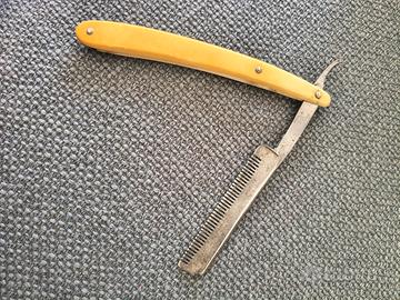 Rasoio a mano libera vintage, modello utilizzato come sfoltino per capelli, caratterizzato dalla presenza di un pettine integrato sulla lama progettato per sfoltire i capelli e rifinire il taglio.