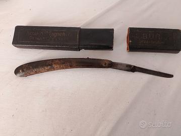 Come da foto, vendo antico rasoio da barba a mano libera della marca BUR, fabbricato a Solingen (Germania). Compresa nel prezzo la sua custodia originale marchiata "Acciaio Magnetico". La parte metallica è stata trattata con olio protettivo Owatrol per fermare l'ossidazione del tempo e mantenere la patina originale dell'acciaio. Il manico è stato invece nutrito e lucidato con apposita cera. Perfetto per collezionisti o per chi ama gli oggetti di barberia d'epoca.