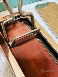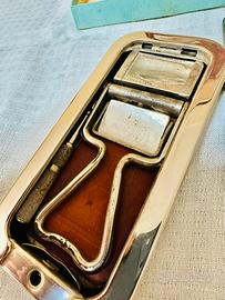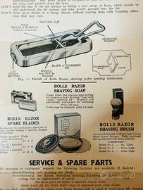 Fantadtico; RARO per condizioni “ Rasoio vintage Rolls Razor, specificamente il modello Imperial No. 2, prodotto dalla Rolls Razor Ltd. a Londra, Inghilterra. Questo iconico set da barba, noto per il suo design sofisticato, è stato prodotto indicativamente tra il 1922 e il 1958. Caratteristiche del Rolls Razor Il Rolls Razor non è un semplice rasoio, ma un sistema di rasatura autonomo e durevole: Custodia Multifunzionale: La scatola metallica nichelata o cromata, decorata con un motivo a greca, funge sia da contenitore che da meccanismo di affilatura. Lama "Hollow Ground": A differenza dei moderni rasoi di sicurezza con lame usa e getta, il Rolls utilizza una singola lama spessa in acciaio, progettata per essere affilata e utilizzata per anni. Affilatura Integrata: All'interno della custodia sono presenti una pietra per affilare (grigia) e una coramella in pelle (rossa) per ravvivare il filo della lama prima di ogni uso.