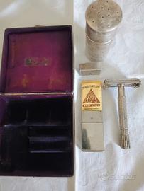 in argento il marchio Gillette si trova sul fondo della scatola sul rasoio e sul porta lamette.La scatola è un po' rovinata sul fondo come potete vedere dalle foto . L' interno della scatola è in buone condizioni compresi gli accessori . Tutto sommato visto l' epoca anni 30 direi buone condizioni ..