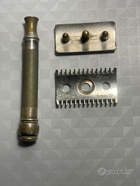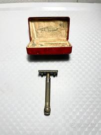 Vendo rasoio Gillette Vintage “NEW”originale degli anni 30, prodotto negli Stati Uniti. Modello a pettine aperto (Open Comb) con manico “Ball End”. E’ di famiglia, conservato così come lo si vede in foto, con la sua patina originale. Segnalo due dentini esterni del pettine leggermente piegati e visibili in foto. L’astuccio rigido è incluso, ed è quello originale dell’epoca con interno in tessuto