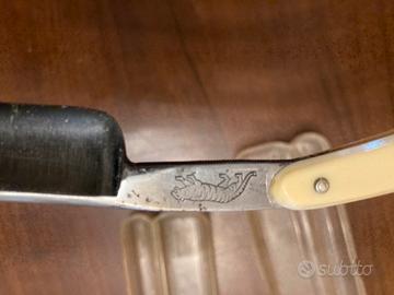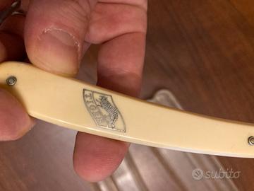 Buone condizioni, manico integro, la lama presenta un segno ed una iscrizione parzialmente leggibile. Manico in celluloide. Prezzo trattabile.