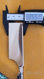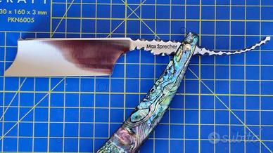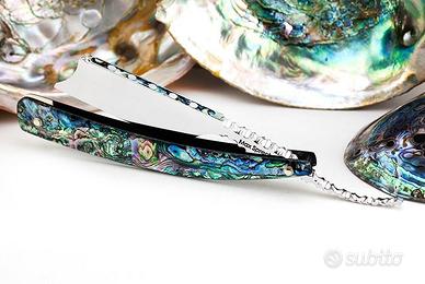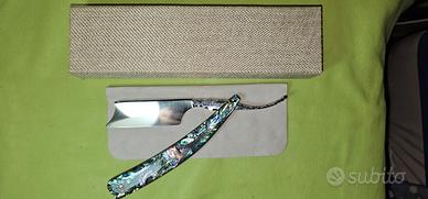 Stupendo Rasoio Custom realizzato artigianalmente in USA dal maker Belga MAX SPRECHER, noto per la sua maniacale precisione e pignoleria nell'estetica.. Lama in acciaio 01 (100MnCrW4) da 9/8", 1/2 Hollow con puntaspagnola. Guancettte in Abalone + acrilico. Codolo a coda di scimmia. Spina curva con 5 x bit e pezzi 'black opal' rotondo. Intarsio superiore tang con bit e pezzi 'black oppal' inlay. Articolo da collezione mai usato con affilatura originale.