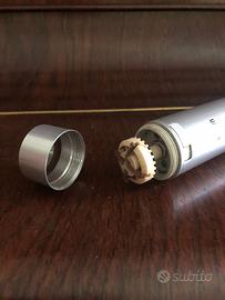 Il rasoio ha un corpo cilindrico in alluminio spazzolato ed è in buone condizioni, con segni di usura.