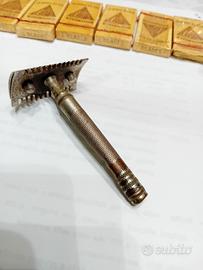 rasoio vi tagliando, piccola ammaccatura sul manico, con 6 pacchi lamette originali.