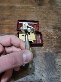 Vero pezzo di storia della rasatura tradizionale (Wet Shaving), vendo splendido set Valet Auto-Strop Safety Razor originale degli anni '30/'40, prodotto in Inghilterra. Questo modello è celebre per il suo sistema unico che permetteva di affilare la lametta direttamente all'interno del rasoio utilizzando una coramella in cuoio (strop), senza doverla rimuovere. Il set include: Rasoio originale: In metallo con impugnatura zigrinata, meccanismo a scatto perfettamente funzionante. Presenta una bellissima patina del tempo. Custodia originale: In bachelite con raffinato effetto tartarugato marrone/nero, punzonata all'interno con il logo "Valet Auto-Strop Safety Razor - Made in England". Lamette vintage: Incluse alcune lamette originali "Auto Strop Blade" ancora nella loro confezione di carta (uso collezionistico). Condizioni: L'oggetto è in ottime condizioni estetiche e meccaniche, come visibile in foto. La custodia è integra e senza crepe. Un pezzo immancabile per collezionisti o amanti del grooming d'epoca.
