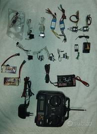1 aereo Easystar completo ( ricevente, motore, servocomandi), radio hitec flash5 (2 quarzi), 3 riceventi (hitec, multiplex, jtronic), 2 motori brushless lipotech, 2 variatore lipotech, liposaver Jtronik. 6 servocomandi GWS, caricabatterie veicolare Robbe, + di 13 eliche varie misure, 5 ogive (di cui 1 con elica pieghevole), adattatori eliche vari, + di 12 ruote varie misure, accessori e minuterie varie, manuali vari.