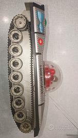 Veicolo cingolato in latta e plastica con telecomando, prodotto dalla REEL negli anni '70. L' oggetto e' privo di pile e non e' stato testato.