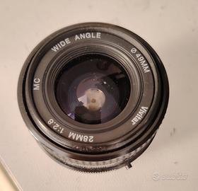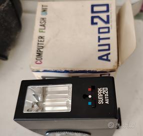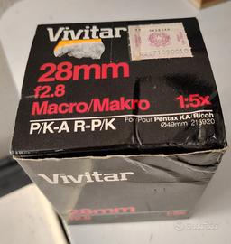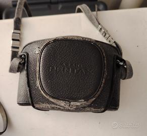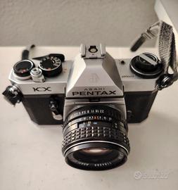 fotocamera reflex analogicaAsahi Pentax KXdegli anni '70, un oggetto da collezione apprezzato per la sua robustezza meccanica. Tipo:Fotocamera SLR 35mm meccanica. Periodo:Prodotta a partire dal 1975. Caratteristiche:Dispone di un sistema di misurazione dell'esposizione e monta obiettivi con attacco Pentax K. Ottica:Dotata di un obiettivo SMC Pentax 55mm f/1.8. + obiettivo fotografico vintage Vivitar 28mm f/2.8 MC Wide Angle. Tipo: Obiettivo grandangolare a focale fissa. Apertura: Massima f/2.8f / 2.8 𝑓/2.8 , minima f/22f / 22 𝑓/22 Messa a fuoco: Manuale. Diametro filtri: 49mm. Caratteristiche: Obiettivo economico e leggero, adatto per la fotografia di strada e paesaggi. + flash fotografico vintageSunpak Auto 20. Tipo:Flash elettronico compatto per fotocamere reflex o a telemetro d'epoca. Caratteristiche:Dispone di modalità automatica e manuale, con montaggio a slitta. Stato:Solitamente venduto come oggetto da collezione o per fotografia analogica retrò.
