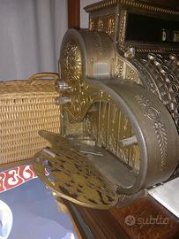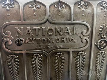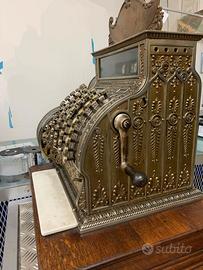Registratore di cassa manuale originale prodotto tra la fine del XIX e l’inizio del XX secolo dalla National Cash Register Company (NCR), Dayton, Ohio – USA. Struttura in metallo nichelato/ottone, arricchita da raffinate decorazioni floreali in stile Liberty, con basamento in legno e inserto in marmo bianco. Tutti i meccanismi interni sono completi e perfettamente funzionanti, inclusa l’apertura automatica del cassetto portadenaro. La macchina presenta una struttura solida e integra, senza cedimenti o parti mancanti, ed è stata regolarmente pulita e lucidata nel tempo. Il registratore è di proprietà dell’attuale venditore da circa 50 anni ed è stato utilizzato esclusivamente come oggetto da esposizione all’interno di una boutique. Pezzo autentico di grande fascino storico e collezionistico, ideale per collezionisti o come elemento di arredo di pregio per ambienti ricercati.