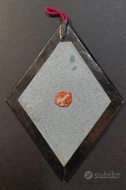Oggetto di devozione con all'intero piccolo frammento di stoffa e scritta S. Cat. de Ricci. La forma è a rombo e misura cm 7,5x10,5. Sul retro piccolo sigillo in cera. Fine '800.