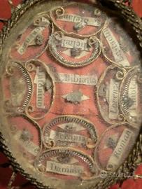 Descrizione: Reliquiario di forma ovale con cornice in metallo intrecciato a motivi raggiati perimetrali, culminante in un anello apicale per sospensione. La fronte è protetta da vetro convesso che consente la visione delle reliquie disposte su fondo in tessuto rosso. All’interno sono collocate 13 reliquie ex ossibus (presumibilmente frammenti ossei) identificate da cartigli su carta sagomata e ornati da motivi a volute in filo metallico. I cartigli, disposti simmetricamente, riportano i seguenti santi: