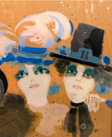 L'opera rappresenta tre figure in maschera, con ampi cappelli e piume.
