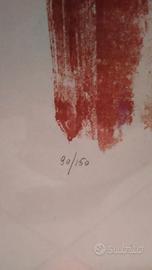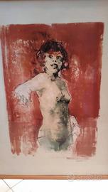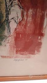 Litografia a colori del 1959 di Renzo Vespignani (Roma 1924-Roma 2001), firmata e datata in basso a destra, numerata 90/150 in basso a sinistra, in cornice di legno con vetro fatta a teca (il retro è apribile come una teca). Dimensioni: soggetto 35 x 50 cm, foglio 46x65,5 cm.