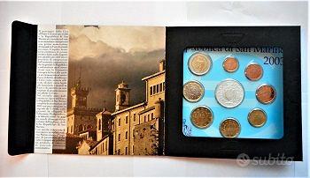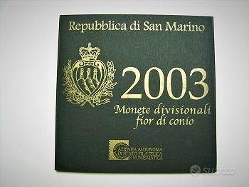Serie ufficiale completa di monete in Lire della Repubblica di San Marino Divisionale annuale ufficiale del 2003. Elegante confezione numismatica contenente la serie completa di 9 monete. Euro fior di conio (FDC) assoluto, chiuse ermeticamente nel suo folder originale. Il tema della monetazione è dedicata a -PASSAGGIO DALLA LIRA ALL'EURO-INDIPENDENZA TOLLERANZA E LIBERTA'- e i valori sono di : cent.1 – 2 – 5 – 10 -20- 50 – euro 1 (bimetallico) – 2 (bimetallico) – 5 (argento).