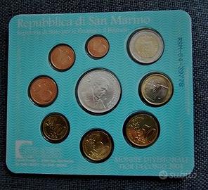 Serie ufficiale completa di monete in Lire della Repubblica di San Marino Divisionale annuale ufficiale del 2004. Elegante confezione numismatica contenente la serie completa di 9 monete. Euro fior di conio (FDC) assoluto, chiuse ermeticamente nel suo folder originale, i valori sono di : cent.1 – 2 – 5 – 10 -20- 50 – euro 1 (bimetallico) – 2 (bimetallico) – 5 (argento). La più preziosa e importante moneta della serie è quella di 5 euro in argento dedicata a -BARTOLOMEO BORGHESI-(1781/1860)-numismatico ed epigrafista italiano naturalizzato sammarinese.
