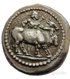 Replica anctica moneta greca Oktodrachm Orescii 475 - 465 AC , moneta con raffigurazione di un toro e un guerriero con tridente. Sul retro, un motivo a losanga. - Materiale: Argentato - Diametro : 33 mm (3,3 cm) - Spessore : 5 mm - Codice : DR17