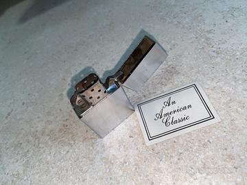 Accendino antivento Zippo in Ottone, in particolare una replica dell'originale del 1932. Gli accendini Zippo sono prodotti iconici americani, resistenti e ricaricabili, noti per il loro caratteristico "click".