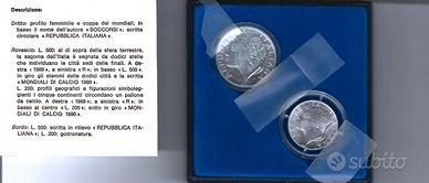 Dittico da 200 e 500 lire (argento FdC) emesso nel 1989 in occasione dei Mondiali di Calcio del 1990.