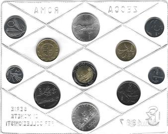 Divisionale completa nei tagli da 1, 2, 5, 10, 20, 50, 100, 200, 500 bimetallica, 500 Ag (Caravelle) e 500 lire Ag (Leopardi).
