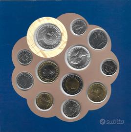 Divisionale completa nei tagli da 1, 2, 5, 10, 20, 50, 100, 200, 500 bimetallica, 500 Ag (Caravelle), 1.000 bimetallica e 1.000 lire Ag (Donizetti).
