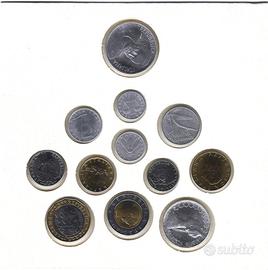 Divisionale completa nei tagli da 1, 2, 5, 10, 20, 50, 100, 100, 500 bimetallica, 500 Ag (Caravelle), 1.000 bimetallica e 1.000 lire Ag (Alfieri).