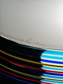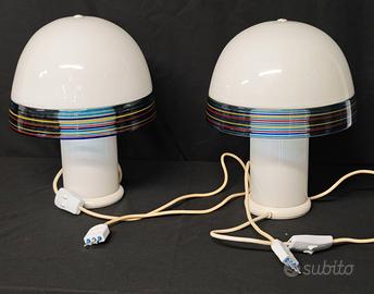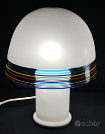 Le lampade presentano una struttura composta da Base cilindrica in vetro, Ampia cupola opalina bianca e Fascia centrale decorata con canne policrome fuse in vetro.