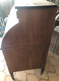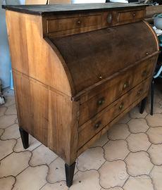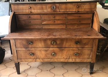 Ribalta a rullo dei primi 800, lastronata in noce, lievi restauri da effettuare, angolo del piano verso l’esterno, e laterali della ribalta, mobile molto pesante, al suo interno segreto per custodire oggetti, le misure sono altezza 111 larghezza 129 profondita’ 56, mobile da ritirare sul posto, cortesemente no a perditempo, grazie!