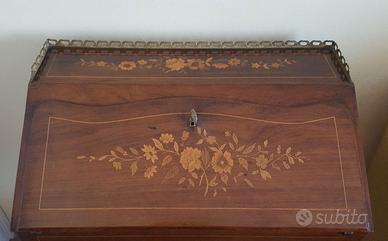 Ribalta secretaire en portefeuille della seconda metà dell'800, in stile Luigi XV, di produzione francese. In noce e palissandro filettata e intarsiata con motivi floreali, ottoni originali dorati e cesellati. All'interno tre cassettini e ripiano scorrevole segreto. Piano interno con panno rosso originale, serratura e chiave originali e funzionanti. Buone condizioni, con qualche segno tipico del passare del tempo.