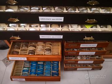 Disponiamo fornitura di ricambi multimarche ed in particolare di vetri vintage per orologi da polso , da tasca , di vari generi e forme , pendole , orologi da tavolo , vetri originali Seiko , Roamer , Citizen ….. ed altro .
