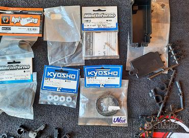 Lotto di ricambi per auto RC Kyosho, principalmente per il modello Mini Inferno.