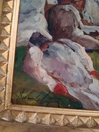 Dipinto originale di Riccardo Capone (XX secolo), raffigurante una suggestiva scena con figure di Pulcinella immerse in un paesaggio costiero. L’opera presenta un gruppo di personaggi colti in un momento di riposo, con una figura in piedi che osserva l’orizzonte. La composizione richiama la tradizione napoletana reinterpretata in chiave moderna e poetica. Interessante l’uso dei contrasti tra i toni chiari delle figure e gli accenti rossi, che donano ritmo e vitalità alla scena. Firmato in basso a sinistra. Tecnica olio su tavola Epoca seconda metà del ‘900 Dimensioni: Senza cornice: cm 26 x 28 Con cornice: cm 36 x 37