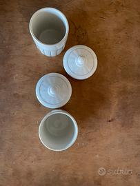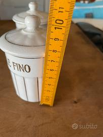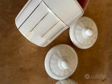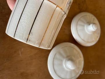 Piccoli barattoli contenitori Sale e Pepe degli anni 30. Segni d'uso nelle parti dorate. Uno è integro l'altro come in foto è sbeccato e presenta felatura.