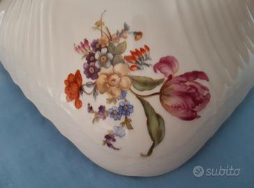 Ad impreziosire questo pezzo già estremamente elegante sono presenti nei quattro angoli esterni stupendi decori con FIORI A MAZZETTO, nonchè un bordo di contorno in ORO ZECCHINO, dipinto a mano.