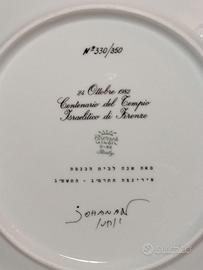 Richard Ginori design Johanan Vitta (Gerusalemme 1941) - Piatto datato 24 Ottobre 1982 in porcellana dipinto a mano commemorativo del centenario (1882 - 1982) della costruzione dei Tempio Maggiore o Grande Sinagoga di Firenze, una delle sinagoghe più grandi d'Europa. In edizione limitata, sul verso " N° 330/350 - 24 Ottobre 1982 Centenario del Tempio Israelitico di Firenze (ndr: scritta ripetuta anche in ebraico) - Richard Ginori D 82 Italy - la firma dell'Artista". In ottime condizioni. Dimensioni: diametro cm 30 - altezza cm 3,5 - base diametro cm 18. Oggetto di qualità museale, altamente collezionabile, dal significato culturale e religioso. Spese di spedizione tracciata ed accurato imballaggio per l'Italia con TuttoSubito; per l'Estero da concordare preventivamente. Ricordo che è sempre possibile il ritiro e/o la presa in visione dell'oggetto a Milano senza alcun impegno di acquisto. La descrizione dell'oggetto è stata redatta nella maniera più fedele possibile e gli eventuali difetti dell'oggetto, se presenti, sono descritti o compaiono nelle foto che fanno parte integrante della descrizione. Se aveste ancora dubbi in merito potete contattare il Venditore per chiarirli prima di fare offerte. Per quanto riguarda la spedizione dell'oggetto, il Venditore si assume l'onere di imballarlo nel migliore modo possibile, comunque l'oggetto viaggia a rischio e pericolo dell'Acquirente ed il Venditore non si risponde di danneggiamenti o furti; quindi, se preferite che la spedizione, oltre che tracciata, sia anche assicurata richiedetelo preventivamente al Venditore.